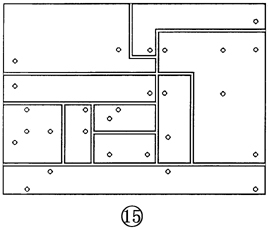 小水塔水位自控电路线路板 见图14、15(焊接面),尺寸45×33mm。线路板可以用刀刻除敷铜板上双线之间的铜箔。