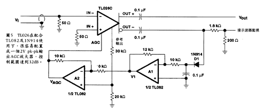 三、自动增益控制 TL026在一个8脚封装里提供差分输入与差分输出,它有50MHZ频宽、38dB最大增益及50dB的AGC范围,在其AGC针脚相对于参考针脚有±180MV的电压变化时,就会令其增益从最小变至最大——图5。 CLC520以一个14脚封装提供160MHz较大的频宽、40dB AGC范围、以及差分输入单端输出。这元件的最大增益由一个外接电阻预设,预设之增益可定于由+6dB 至最大+40dB。而设定在+6dB时,压控增益范围便从+6dB至少于-34dB,又设定在+40dB时,压控增益则由+40dB至少0dB。 CLC520提供高阻抗、差分电压输入,以优于0.5℃线性相位偏差下高达60MHz,及在4V PK-PK输出时仅有0.04%信号非线性。