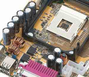 (图为华硕P4T533主板CPU插槽附近的电容,含铝电解电容、钽电容和陶瓷电容等,你能分清吗?)