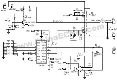 以下讨论参见图5 。如果有了以上的优点,可以在汽车典型的输入电压范围内,使用CS5165A进行额定输出电流为3.5A的设计(外部需要提供负载切断和电池反向的额外保护)。假设读者已熟悉降压 SMPS的基本概念,因此在此只强调本设计更独特的特点。